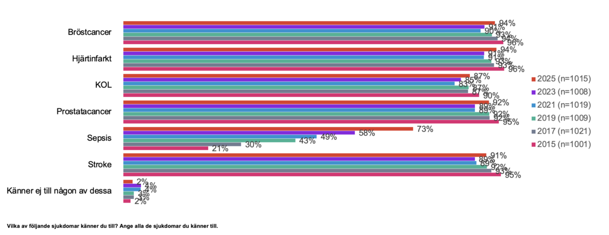 7 av 10 svenskar 18+ känner till sepsis i årets mätning, vilket är en signifikant ökning med hela 15 procentenheter jämfört med föregående studie 2023 (73% 2025 mot 58% 2023). Även i årets mätning är kännedomen om sepsis signifikant högre bland kvinnor än män (81% mot 65%). Kännedomen ökar med åldern och är högre bland svenskar 40 år eller äldre.